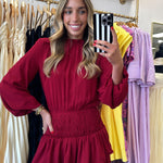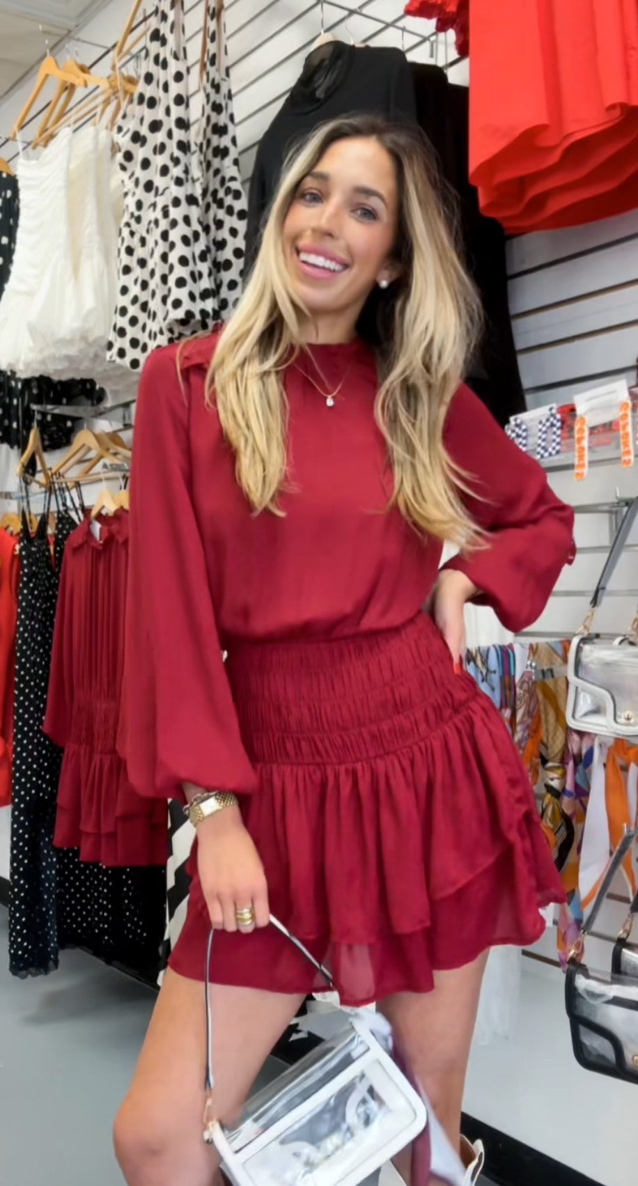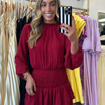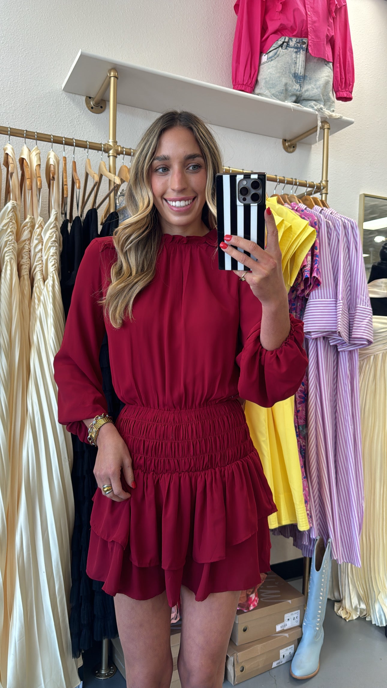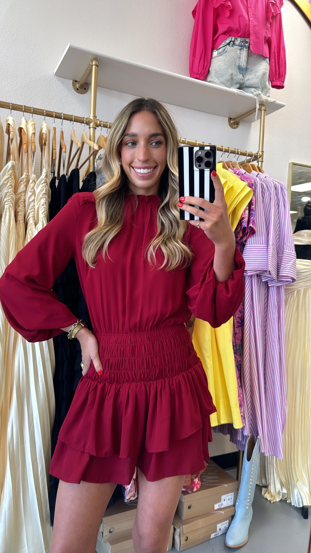 BURGUNDY RUFFLE LONGSLEEVE DRESS