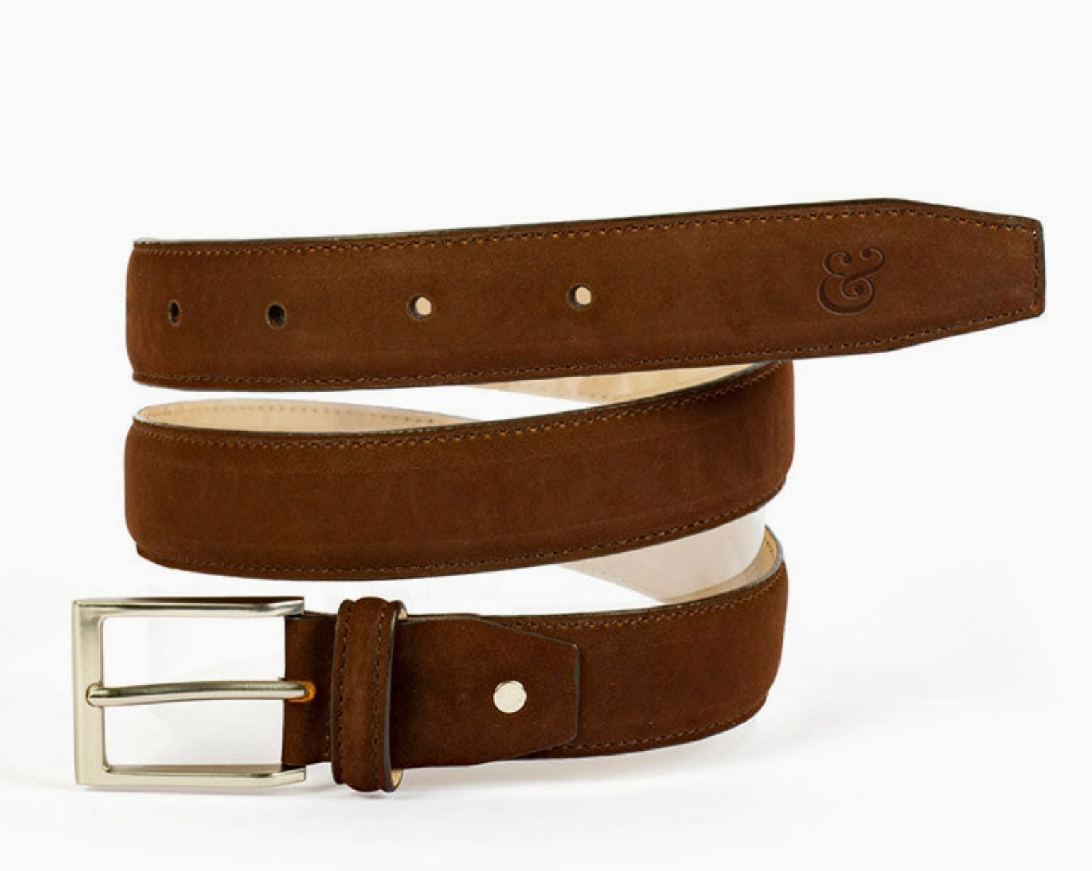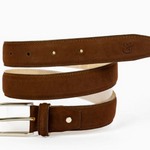 The Brown Brushed Suede Belt is an essential accent to any elevated casual look. Crafted from a velvety brushed suede leather, it provides a perfect finishing for any outfit from the office to drinks out. Pairs perfectly with light or dark shade trousers or denim, your favorite Dress Collar Polo and sweater.  * Genuine leather * Made in Colombia * Custom debossed Collars & Co. '&' logo on the leather belt tip