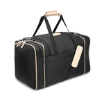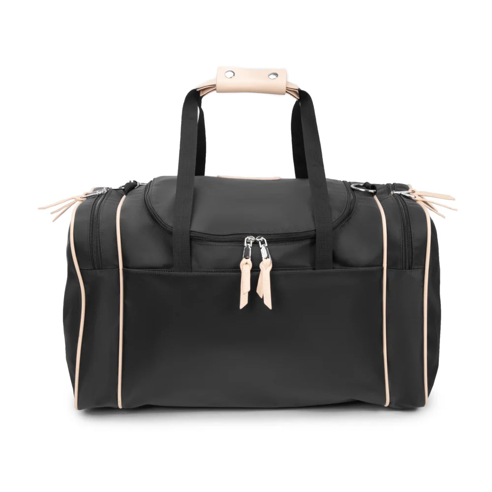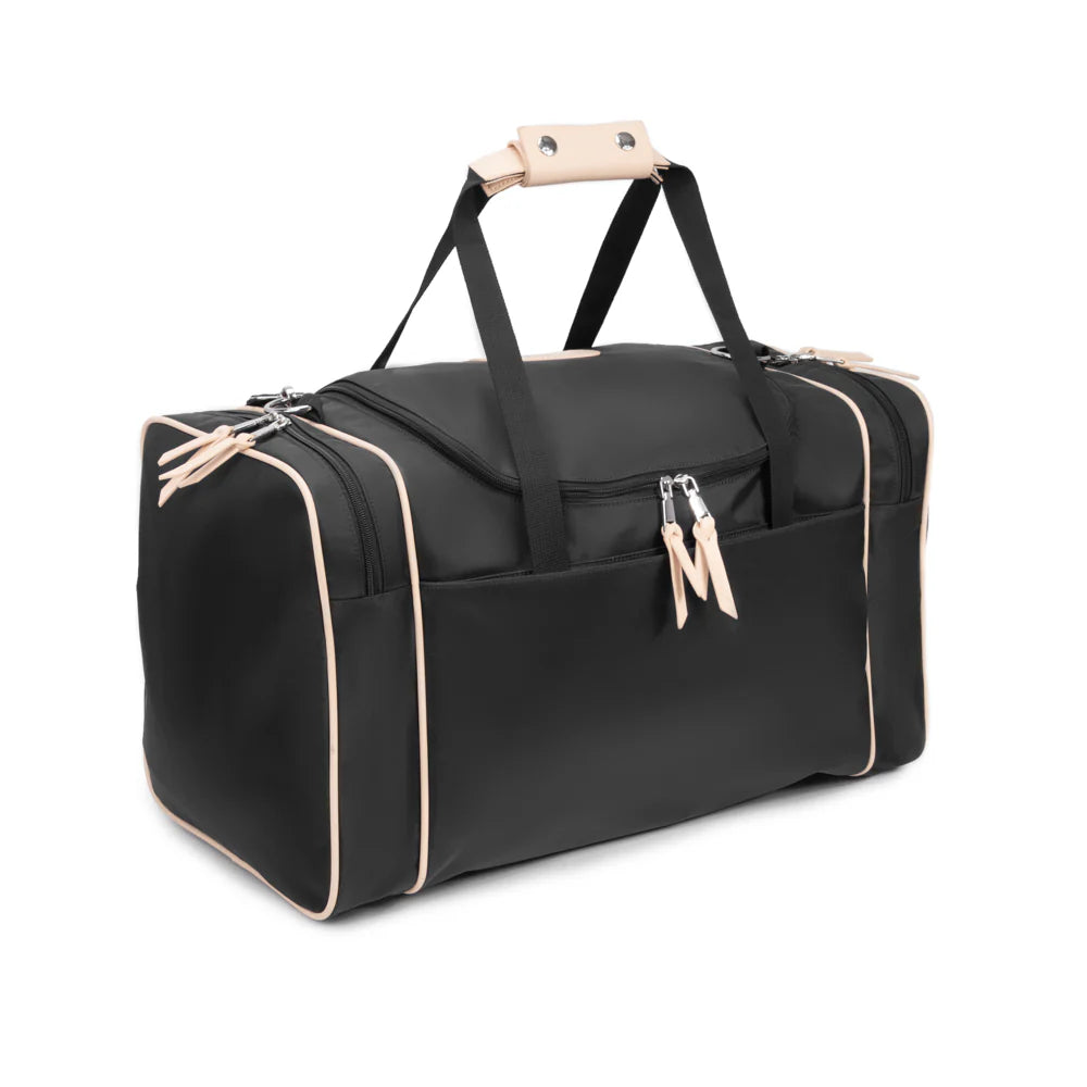 Introducing The Dakota Duffel Bag – the perfect choice for all your travel needs! This chic and stylish bag is designed with the highest quality materials, including a nylon shell with vegan trim, nylon webbing straps, and a vegan leather strap handle and patch for personalization. The bag also features end pockets with double zippers, two open welt large exterior pockets, a nylon trolley sleeve, and a top zipper with large open interior compartment for ample storage of all your belongings. For added convenience, the bag also includes 45"" detachable and adjustable nylon straps with vegan trim, durable silver finish hardware, silver finish metal feet studs, and a polyester striped lining to complete this modern and sophisticated bag. Whether you’re packing for a business trip or weekend getaway, The Dakota Duffel Bag is the ideal choice to help you travel in style.