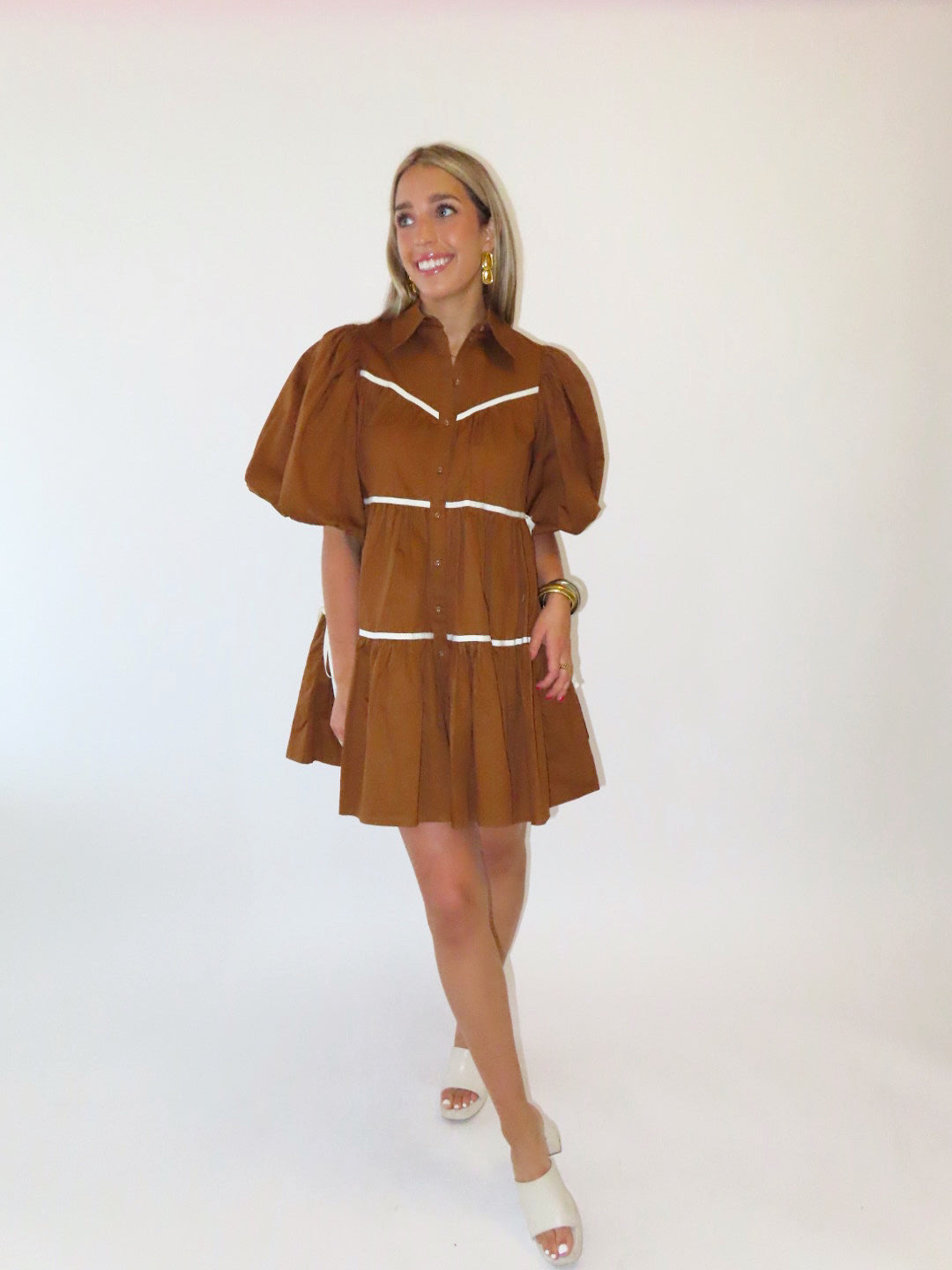 CAMEL BELTED POPLIN TIERED DRESS