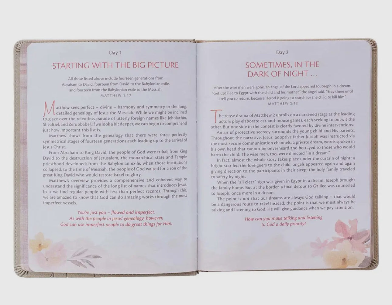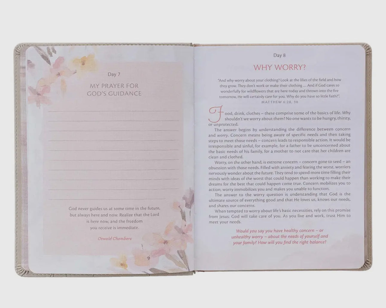 The My Quiet Time Devotional takes women through a 365-day journey into a deeper relationship with God. The cappuccino-colored faux leather devotional offers devotional readings from the New Testament, Scripture meditation, and heartfelt prayer to bring you to a place of rest and refreshment.