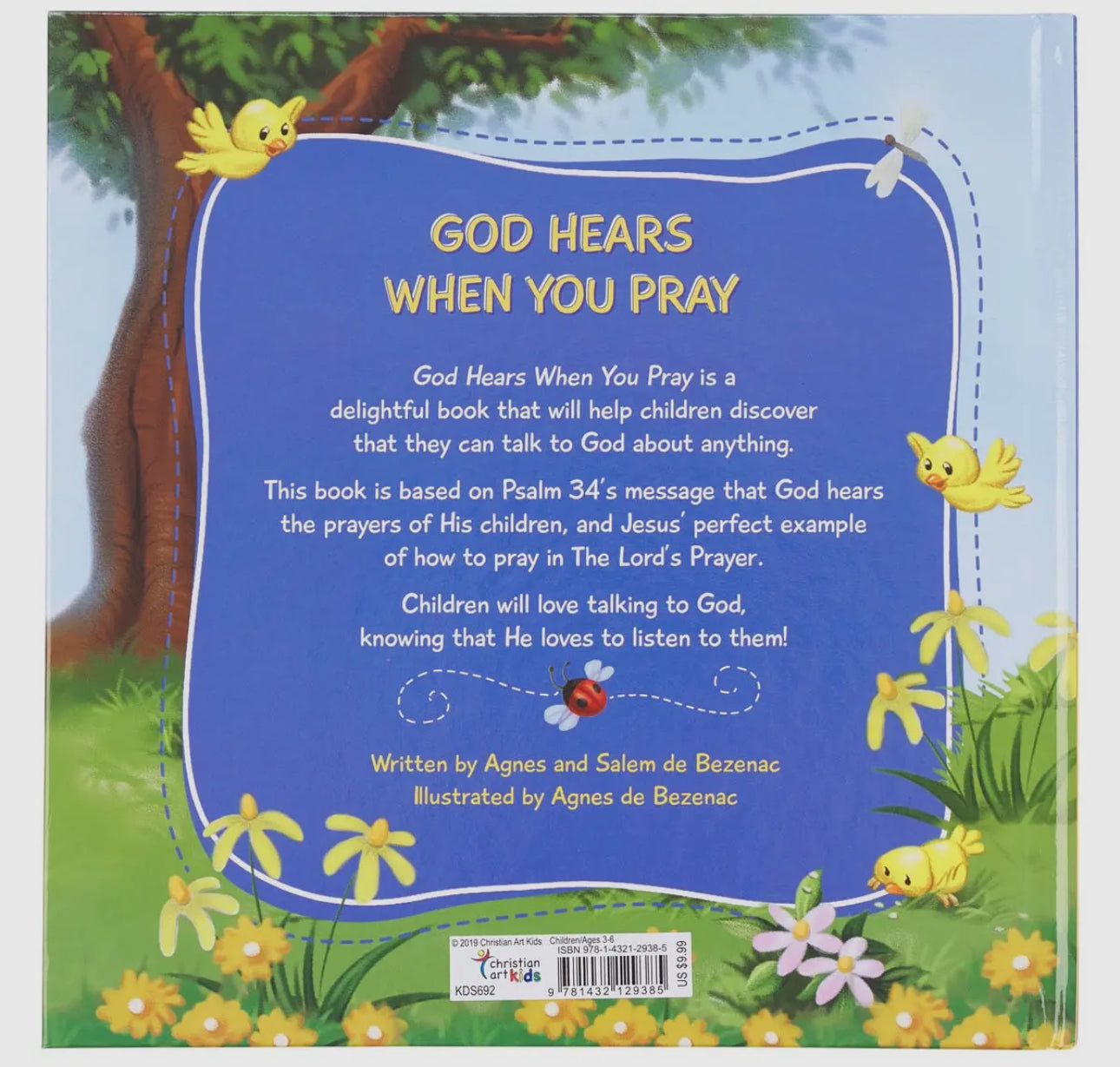 Featuring adorable artwork, God Hears When You Pray, will help parents introduce their little ones to the blessings of a prayer-filled life. The cute illustrations will keep children aged 3-6 engaged as they learn all about talking to God. Praying children cover design, Yellow title,