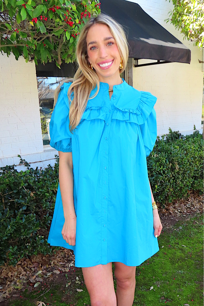 TURQUOISE PUFF SLEEVE RUFFLE DRESS (size large left)