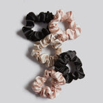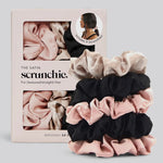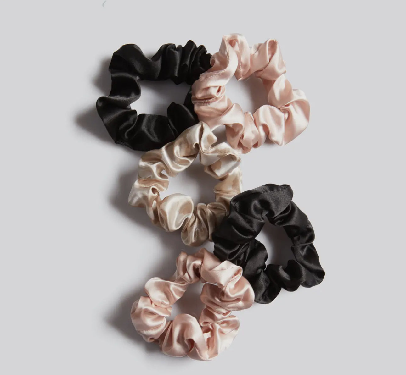 • Each package includes 5 Satin Sleep Scrunchies in assorted black, blush, and leopard print tones.