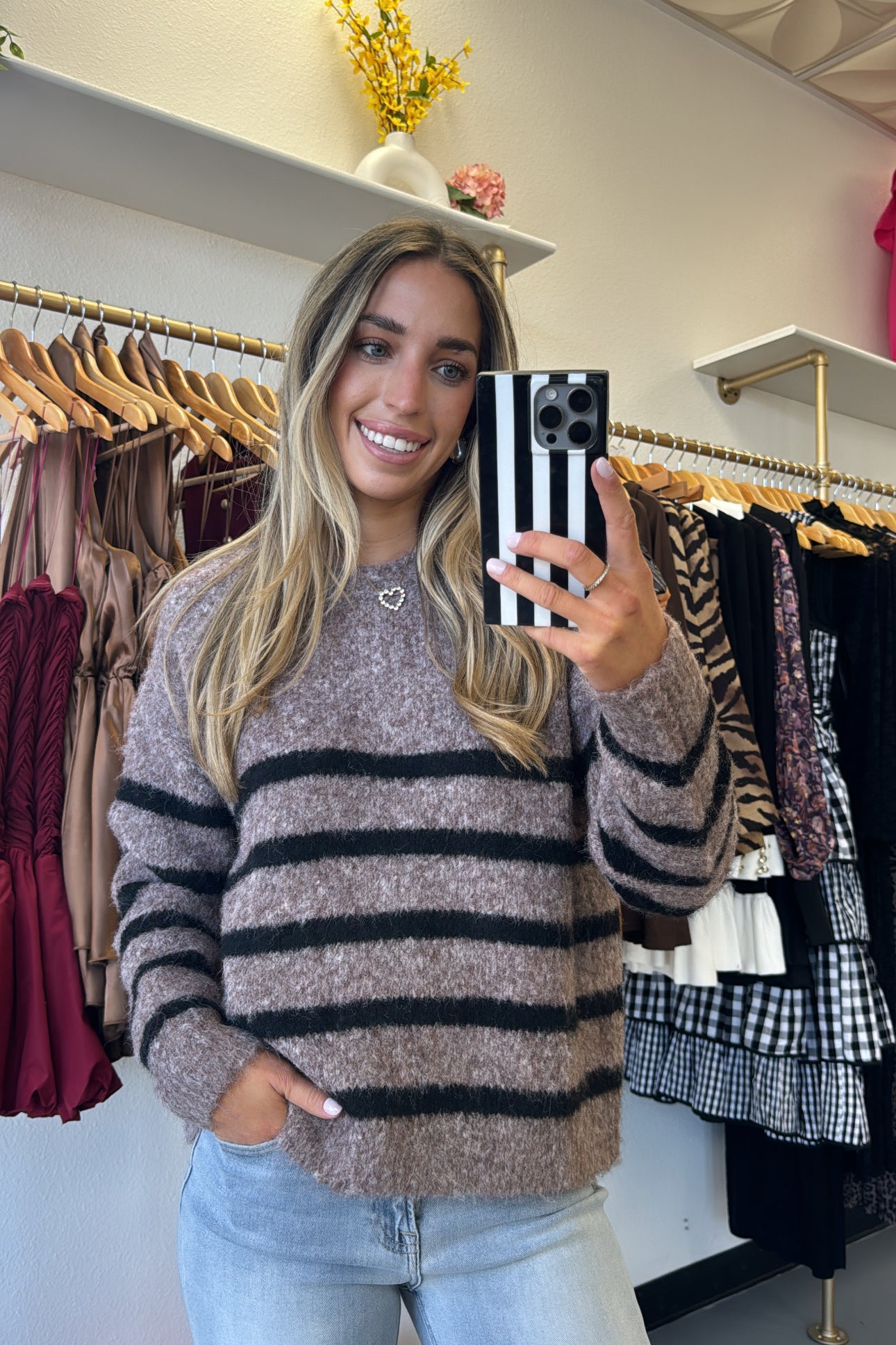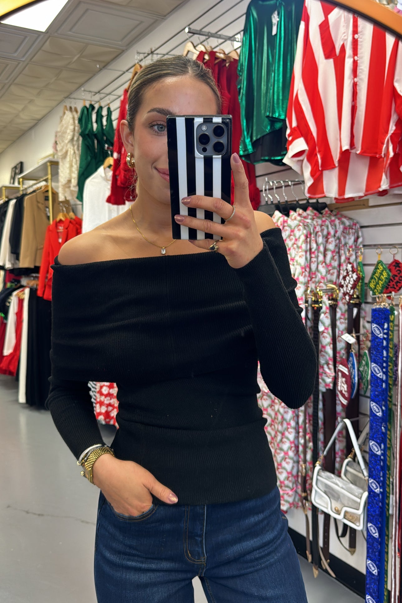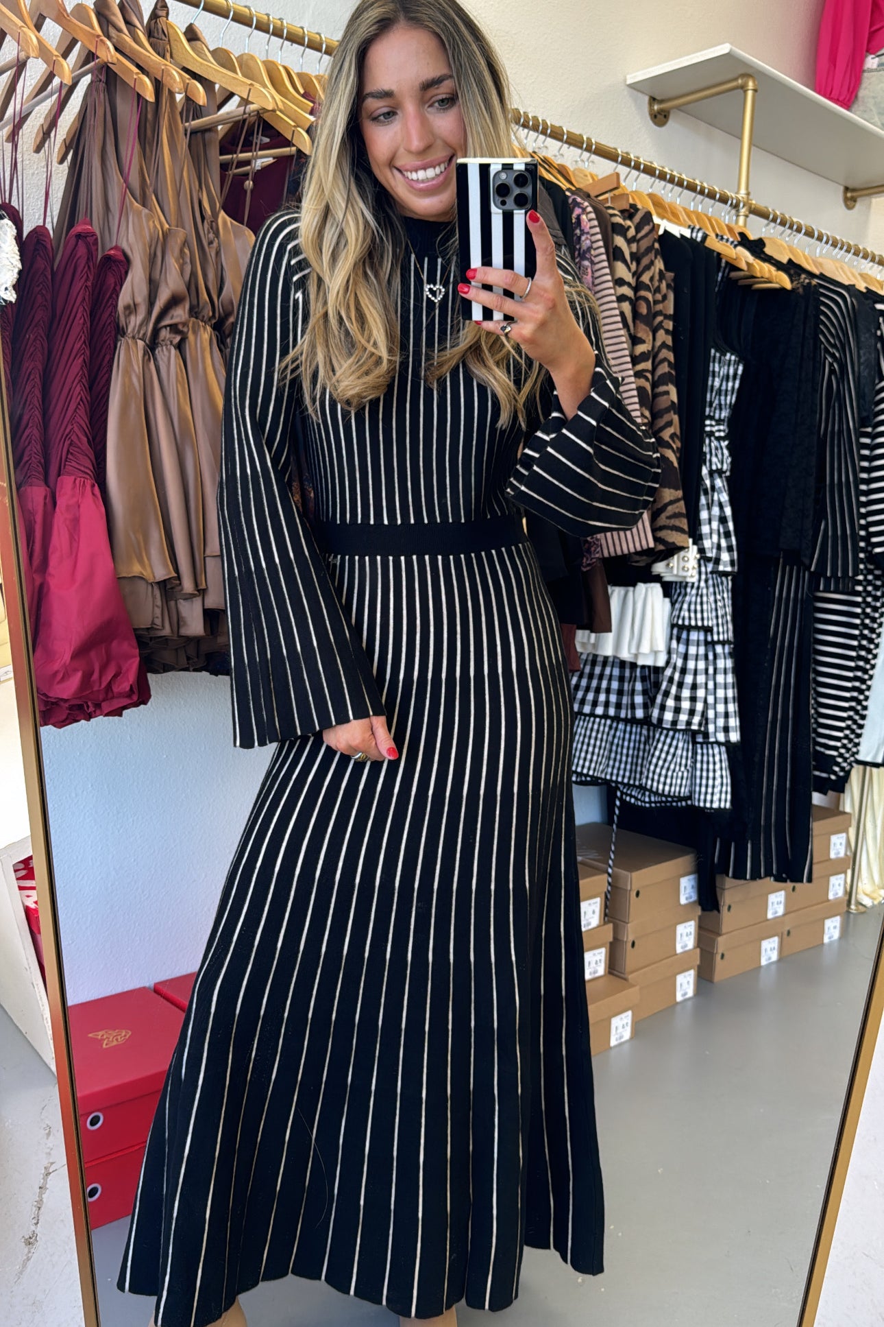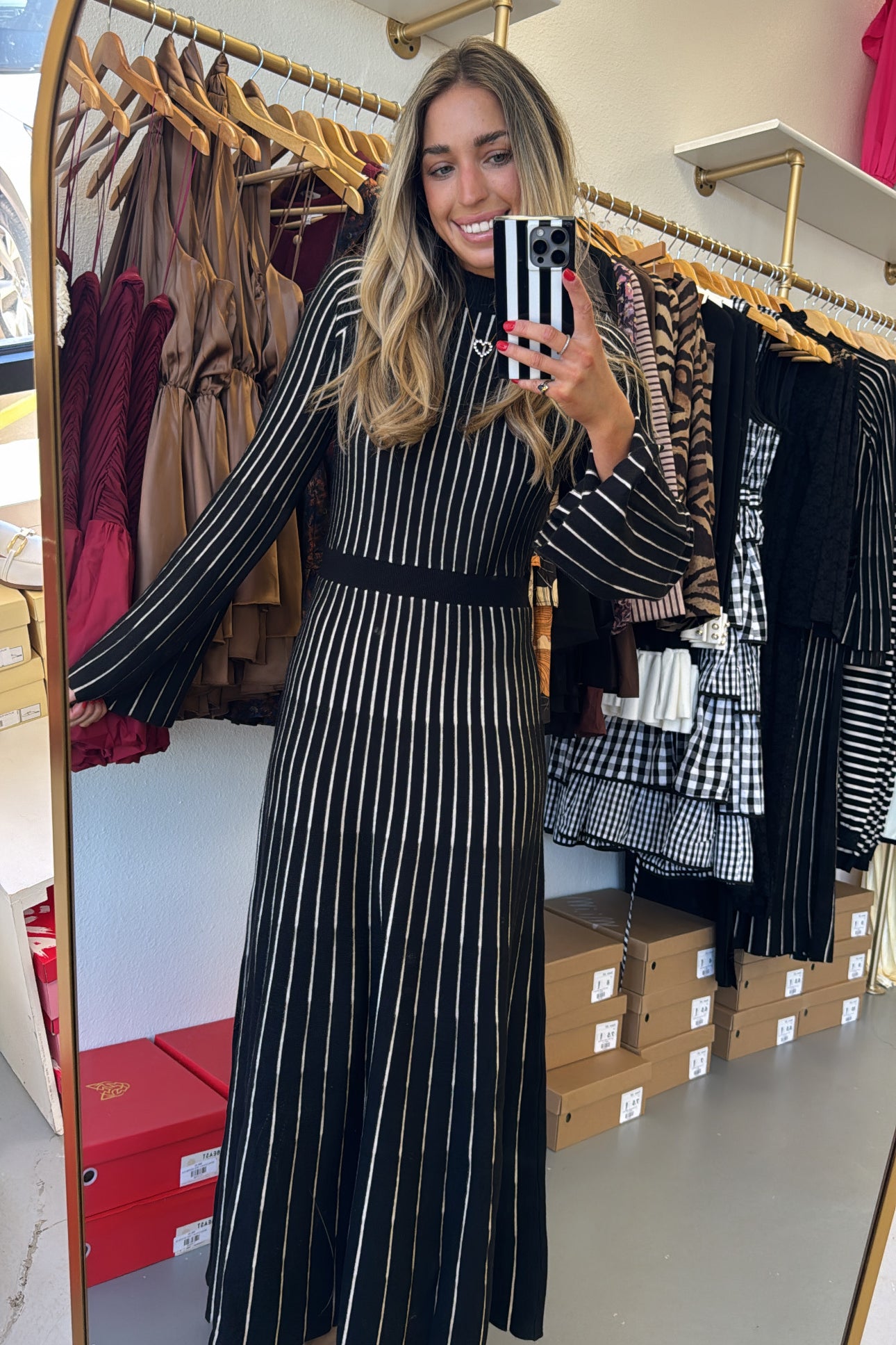 Black Stripe Rib-Knit Bell-Sleeve Maxi Sweater Dress